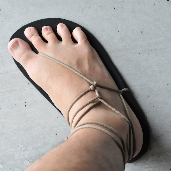 オリジナルが古タイヤを切っただけのモノだし、作りは単純だ。ビブラムソールを足形に切ってパラコードを通しただけ。10分もあれば出来てしまう。コードの通し方にいろいろと工夫があるが、これは使いながらベストなものを見つけていきたい。さて、早速こいつを履いて六甲山を越えて有馬温泉まで走ってみようか!という気にはとてもなれないのだけど…とりあえずは、海岸を軽く走ってフォア・フット・ランに慣れるとしよう。