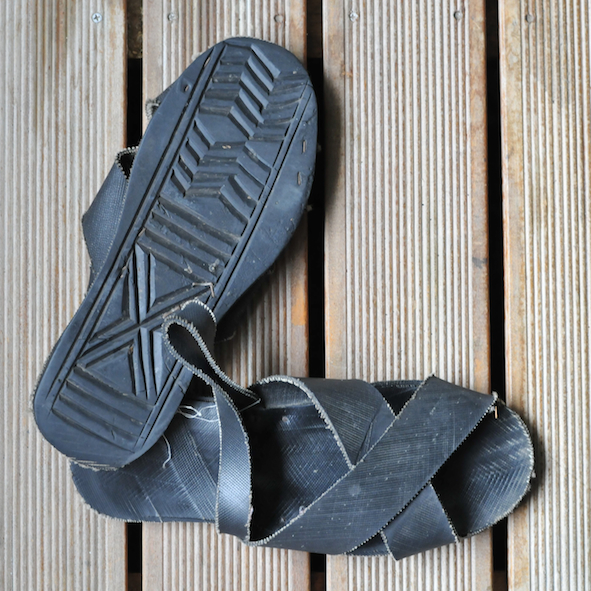古タイヤのサンダルというと、ペルーにもオホタと呼ばれるものがある。農夫達がよく履いているもので、こちらも手作りの逸品である。田舎街のメルカドに行くと地元のおばちゃんがゴザのうえに山のように積み上げて売っている光景を目にする。ワラーチと違い革ひもではなくゴム板で足をホールドするようになっている。とんでもなく頑丈なモノで、写真は僕がクスコで10年以上前に手に入れたものだが、毎夏使っているのにまったく壊れる気配がない。